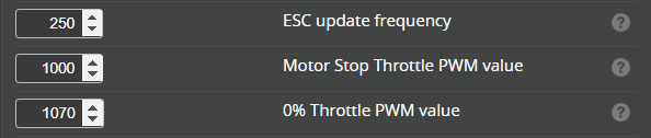 - The default PWM throttle values for FlyRotor ESCs are: