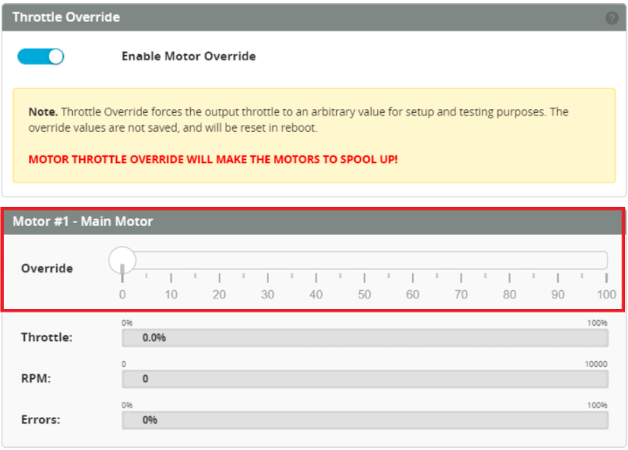 - Lower throttle to 0% in Motor Override and wait for beep confirmation.