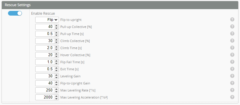 This slows the transition from rescue back to normal mode. This is helpful if you have rescued from inverted where your collective may be in the opposite direction. This prevents it from rapidly pitching down.