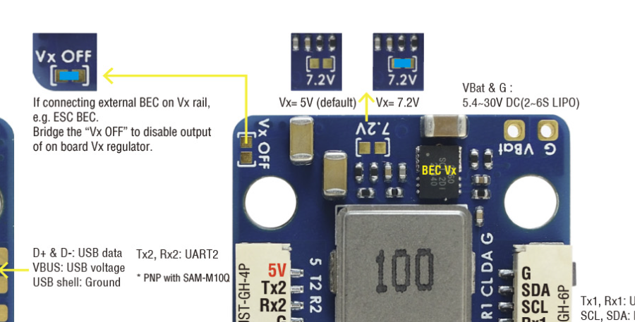 If using an external BEC the internal BEC MUST be disabled via the [Vx Off] solder bridge.