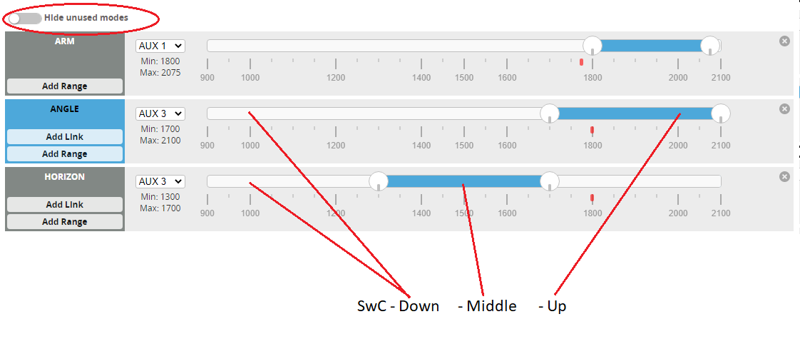 In this example we will configure a 3 position switch (SwC) to select between Stability modes. With the SwC fully down we will have Acro mode, SwC in the centre will be Horizon Mode and in the fully up position we will enable Angle mode.