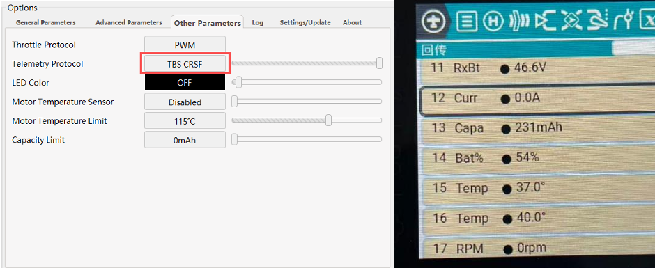 - Choose RF FLYROTOR when integrating with Rotorflight for ESC telemetry protocol.