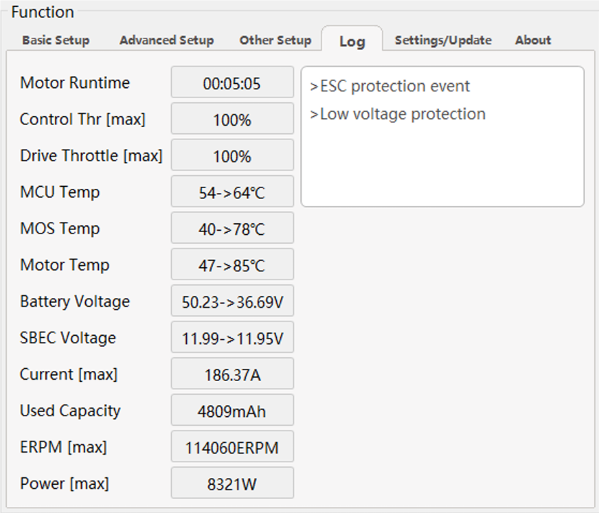 - Shows logging values from previous ESC flights as well as alarms or events that may be of interest.
