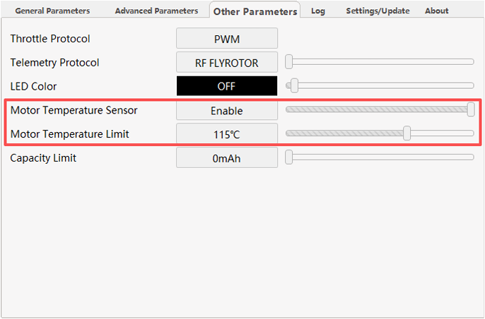 - You should adjust the Motor Temperature Limit between 90–125 °C. When this limit is reached, the ESC will limit throttle output to 50% to prevent overheating.
