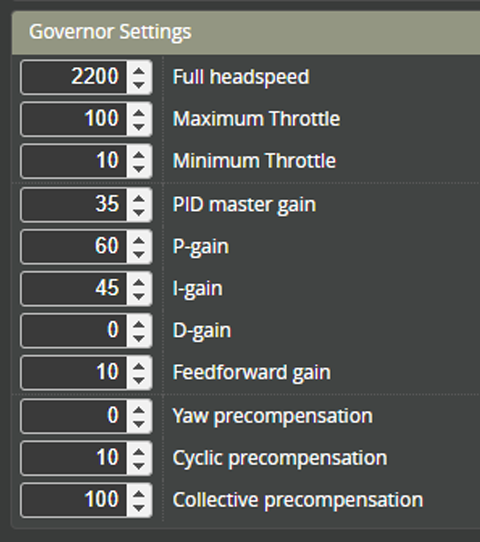 These settings were taken from a 700-class RC helicopter and are provided as an example. You may need to adjust them to suit your specific setup.