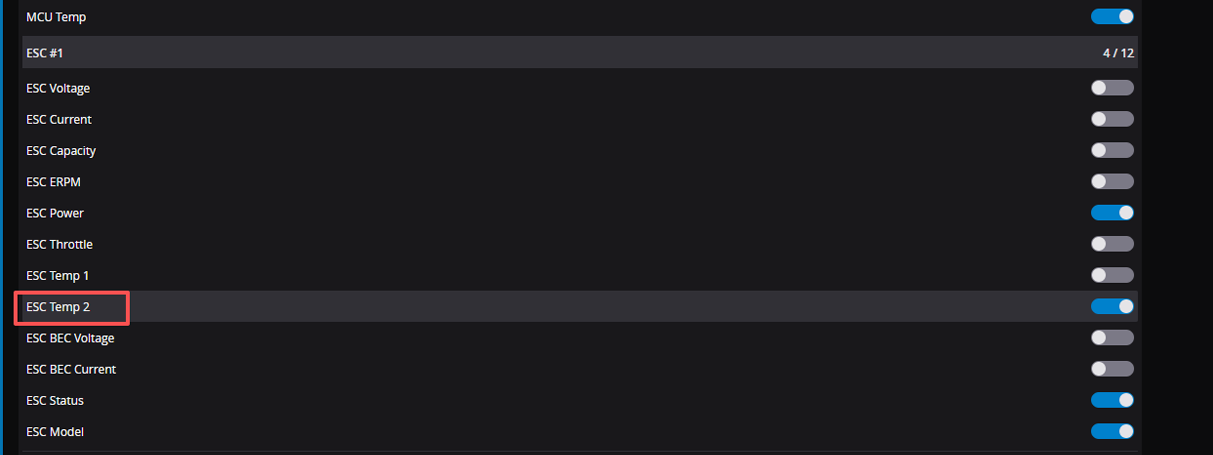 - You need to enable ESC Temp 2 to pass this to the radio telemetry link.