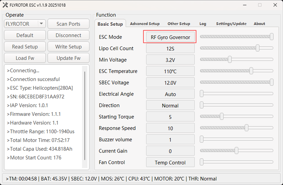 - Change ESC Mode to RF Gyro Governor when using Rotorflight Mode1 Governor.
