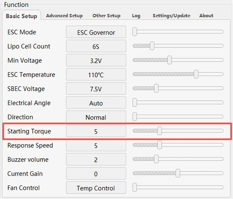 - For RF Gyro Governor or Linear Throttle ESC modes: the Starting Torque setting can be lowered if experiencing a tail whip/kick symptom upon motor spool-up.